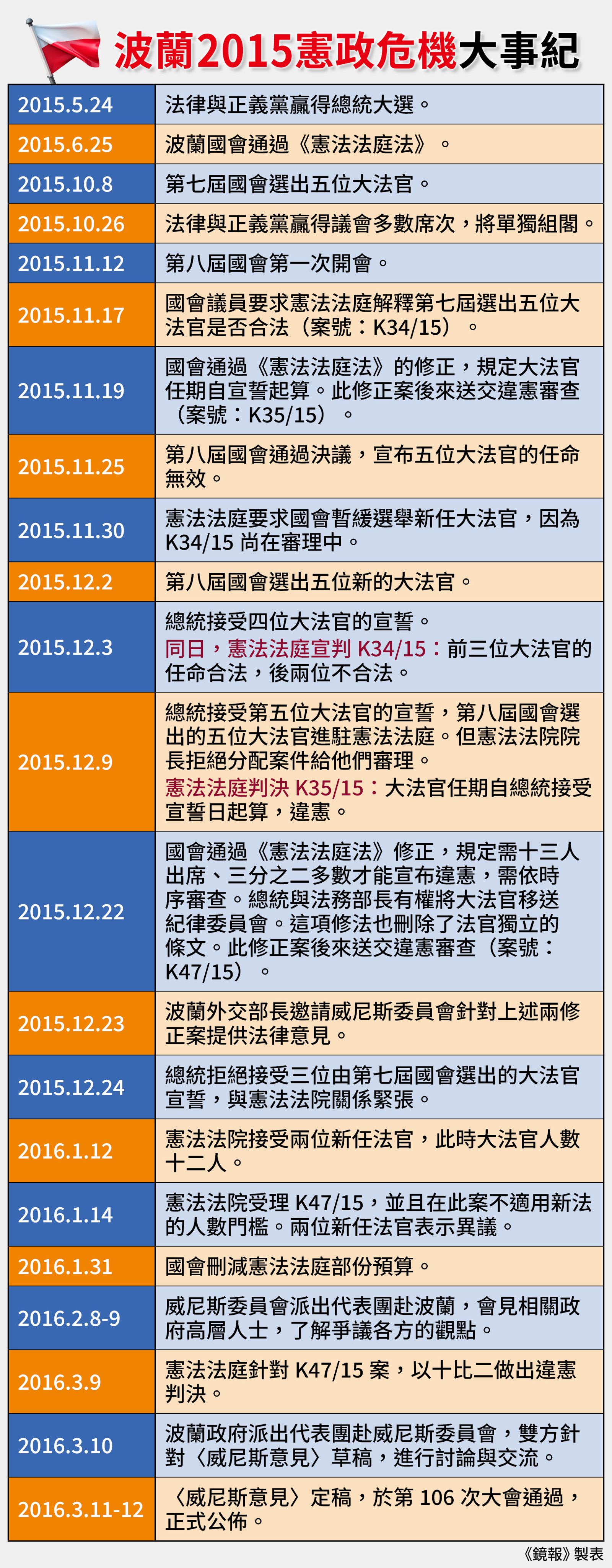 波蘭國會通過《憲法法庭法》修正案的隔天,外交部長就聯繫了威尼斯委員會,雙方隨後展開長達數月的合作。2016年3月9日,波蘭憲法法院針對K47/15案宣布《憲法法庭法》的相關修正違憲,仍然是十二位法官出席、右派政黨選出的兩人持不同意見。結果政府拒絕公佈,理由是他們人數未達十三人出席門檻。三天後,威尼斯委員會也發布了詳盡的專家意見,在波蘭國內政治勢力相持不下的時刻,提供一個專業的視野。接下來就詳細引述並補充相關的背景,做為台灣的參照。
